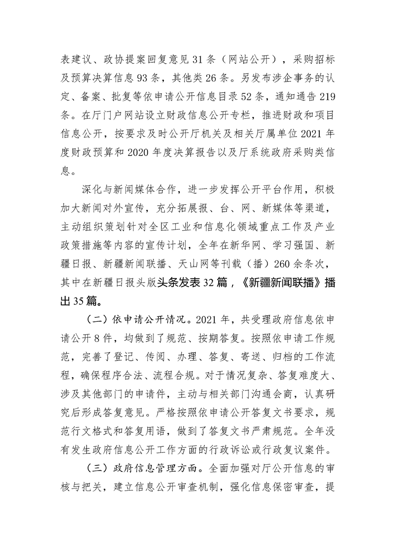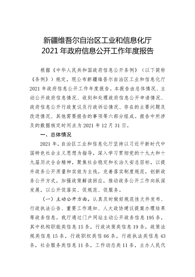新疆维吾尔自治区工业和信息化厅2021年政府信息公开工作年度报告