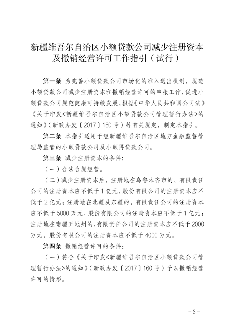 新疆维吾尔自治区小额贷款公司减少注册资本及撤销经营许可工作指引(试行)