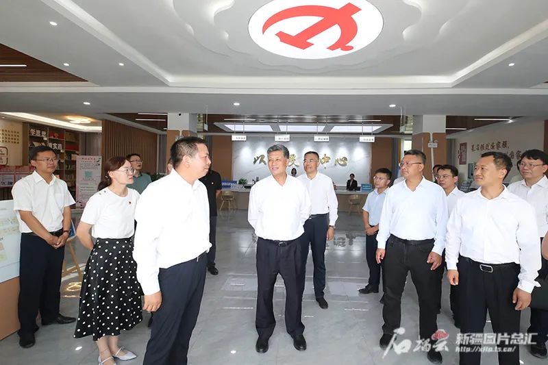 7月24日,自治区党委书记马兴瑞在独山子区新北区街道宣讲调研,同基层干部共同学习感悟全会精神,听取大家对基层改革发展的诉求建议。石榴云/新疆日报记者 崔志坚摄