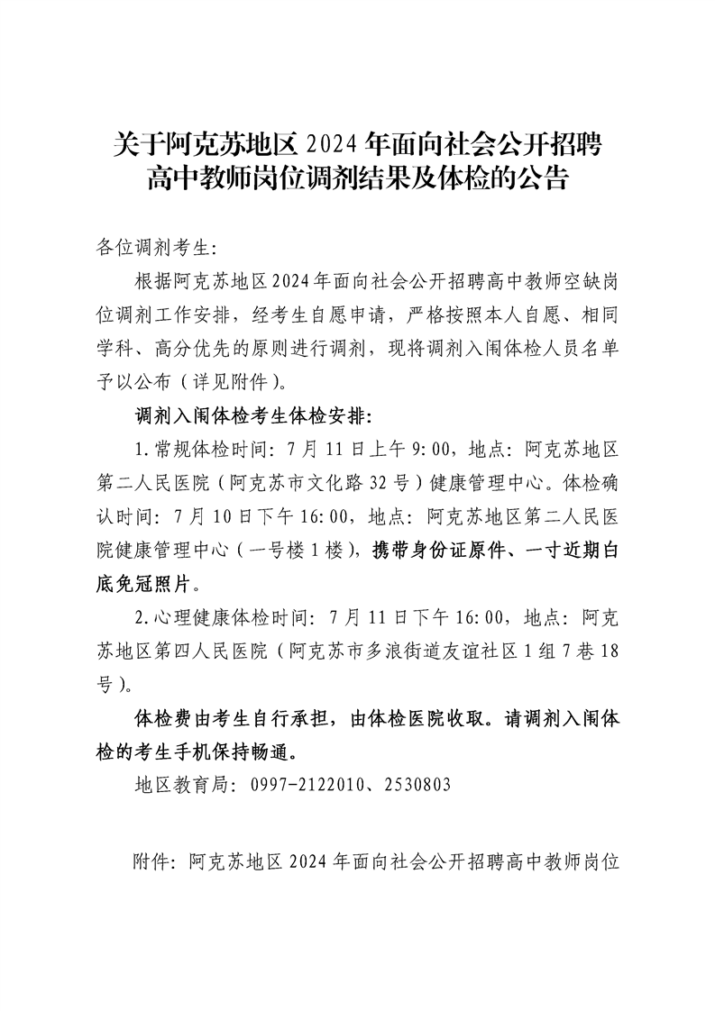 关于阿克苏地区2024年面向社会公开招聘高中教师岗位调剂结果及体检的公告