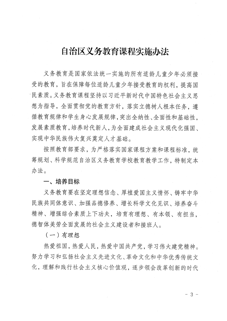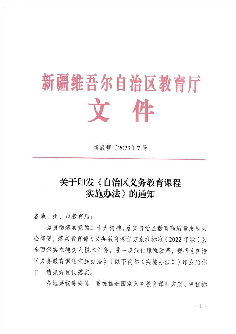 标题:关于印发《自治区义务教育课程实施办法》的通知