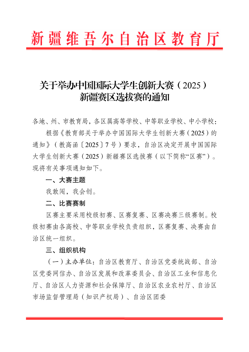 标题:关于举办中国国际大学生创新大赛(2025)新疆赛区选拔赛的通知