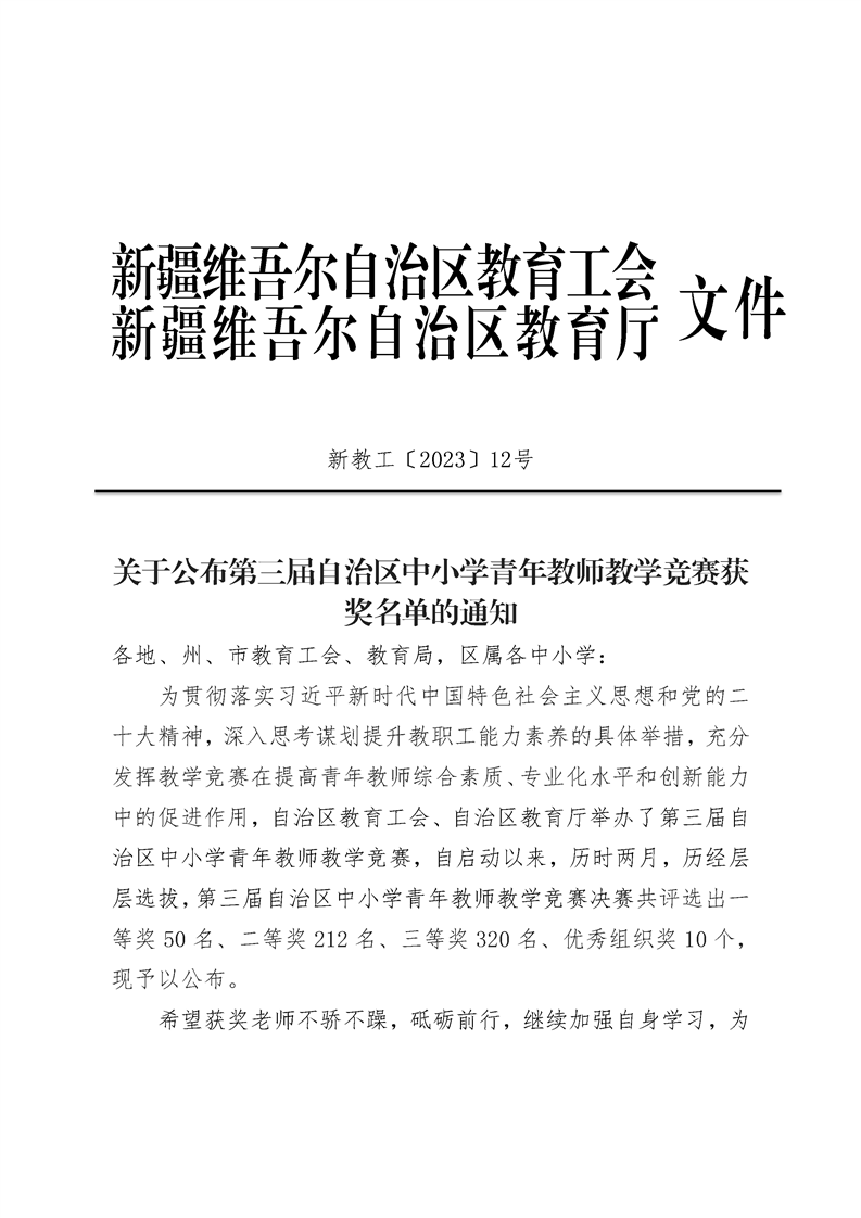关于公布第三届自治区中小学青年教师教学竞赛获奖名单的通知