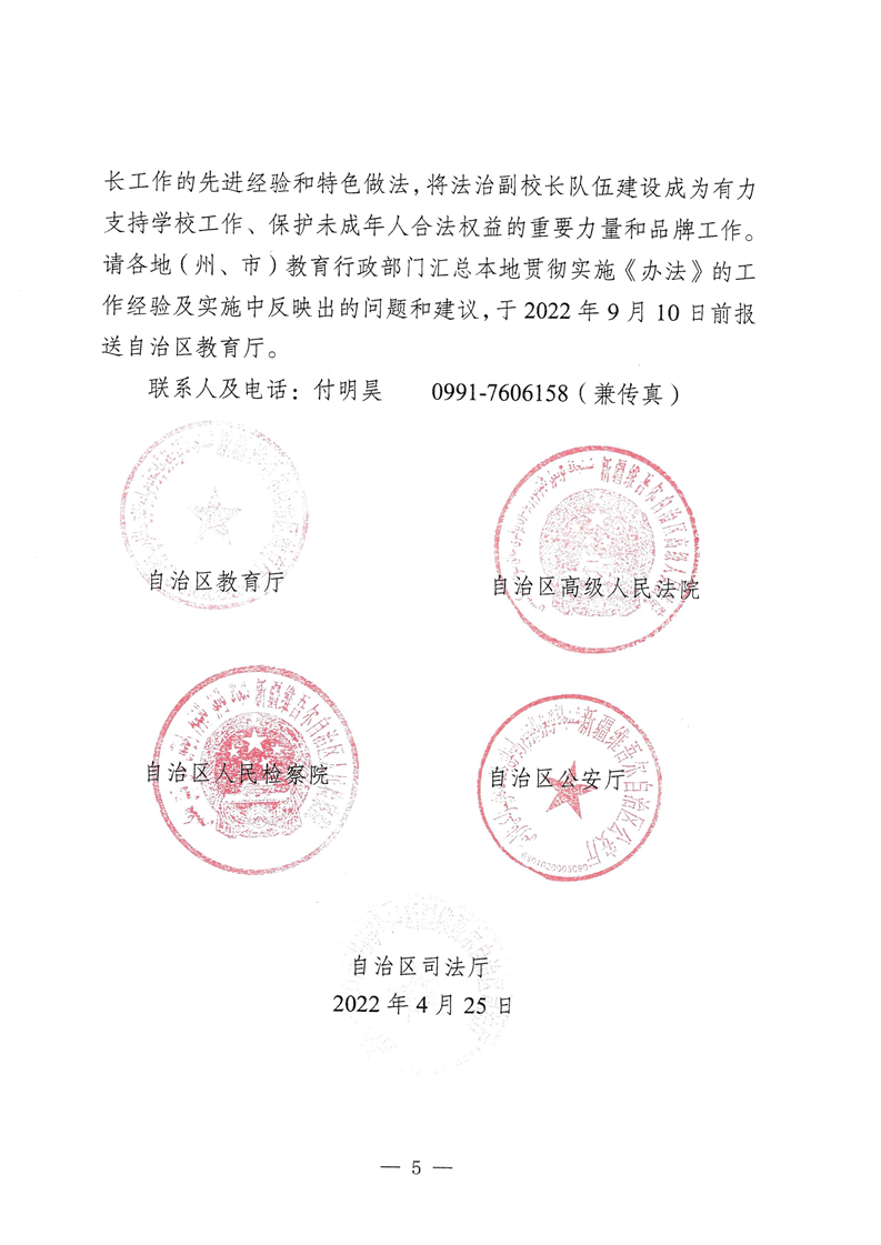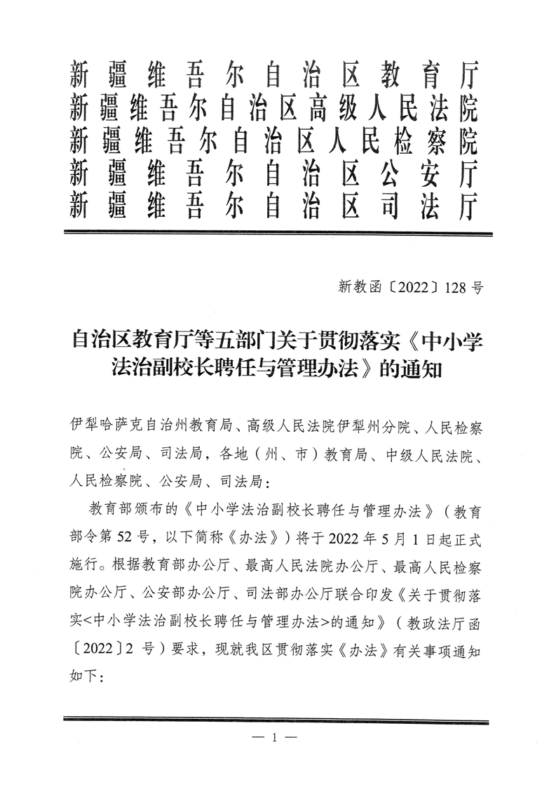 标题:自治区教育厅等五部门关于贯彻落实《中小学法治副校长聘任与管理办法》的通知