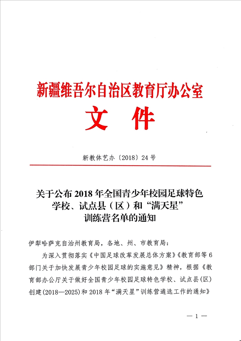 标题:关于公布2018年全国青少年校园足球特色学校、试点县(区)和“满天星”训练营名单的通知