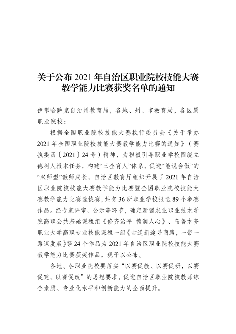 标题:关于公布2021年自治区职业院校技能大赛教学能力比赛获奖名单的通知