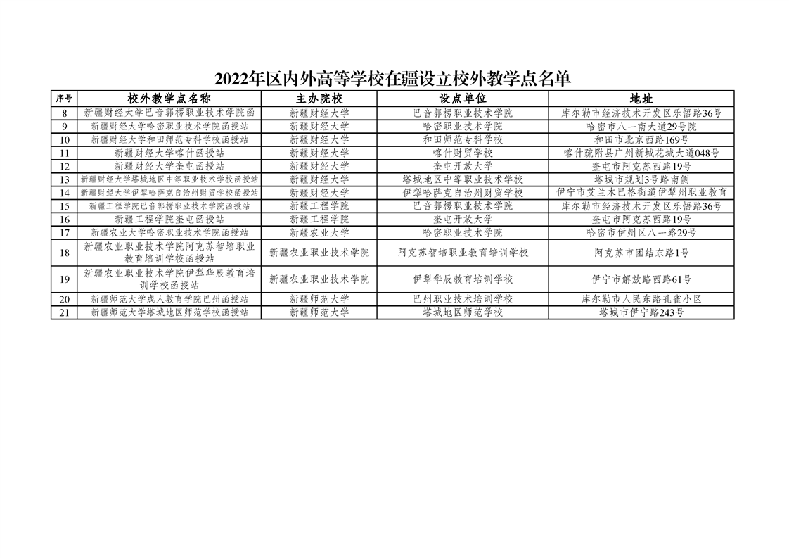 标题:2022年区内外高等学校在疆设立校外教学点名单