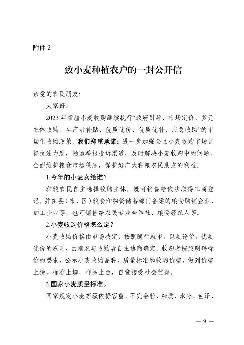 关于印发《2023年新疆小麦收购政策解读》和《致小麦种植农户的一封公开信》的通知