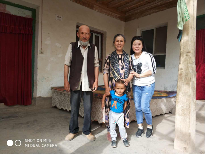 6月8日,清晨阳光明媚,一大早结亲组来到李保萍的亲戚家,探望买买提·艾买提和他的妻子孜来汗·吐尔逊两位老人。一进门,老人连忙放下了手中的活,热情的将结亲组迎进屋,老人紧紧握着我们的手,激动的说:“每次来都给我们送来东西,我们心里非常感谢,我们之间无亲无故,我们对待自己的父母也没有这样,感谢你们千里迢迢来到这里看望我们……”