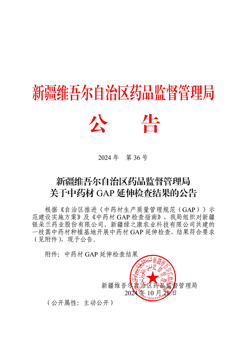 新疆维吾尔自治区药品监督管理局关于中药材GAP延伸检查结果的公告(2024年第36号)