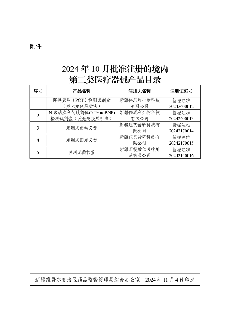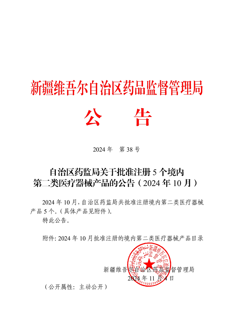 自治区药监局关于批准注册5个境内第二类医疗器械产品的公告(2024年第38号)