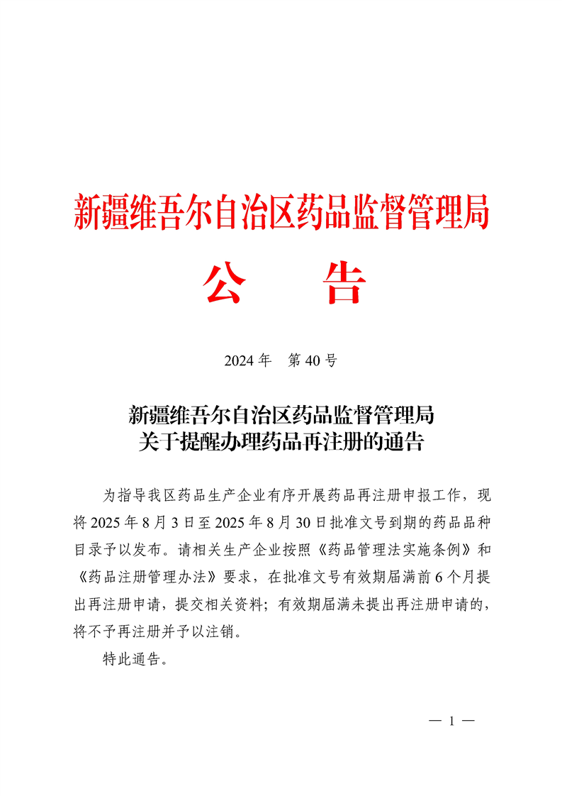 新疆维吾尔自治区药品监督管理局关于提醒办理药品再注册的通告(2024年第40号)