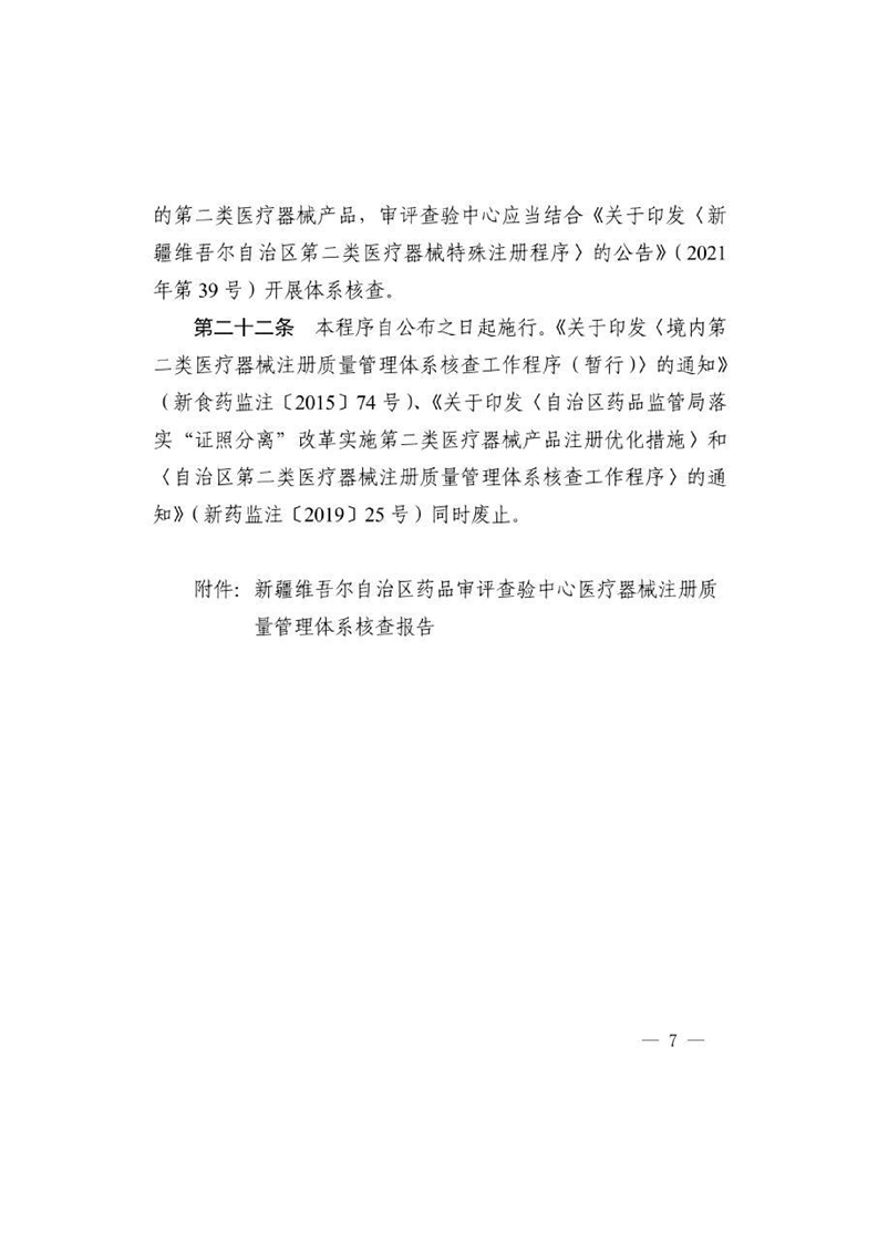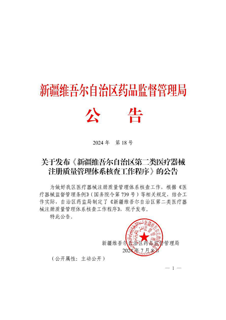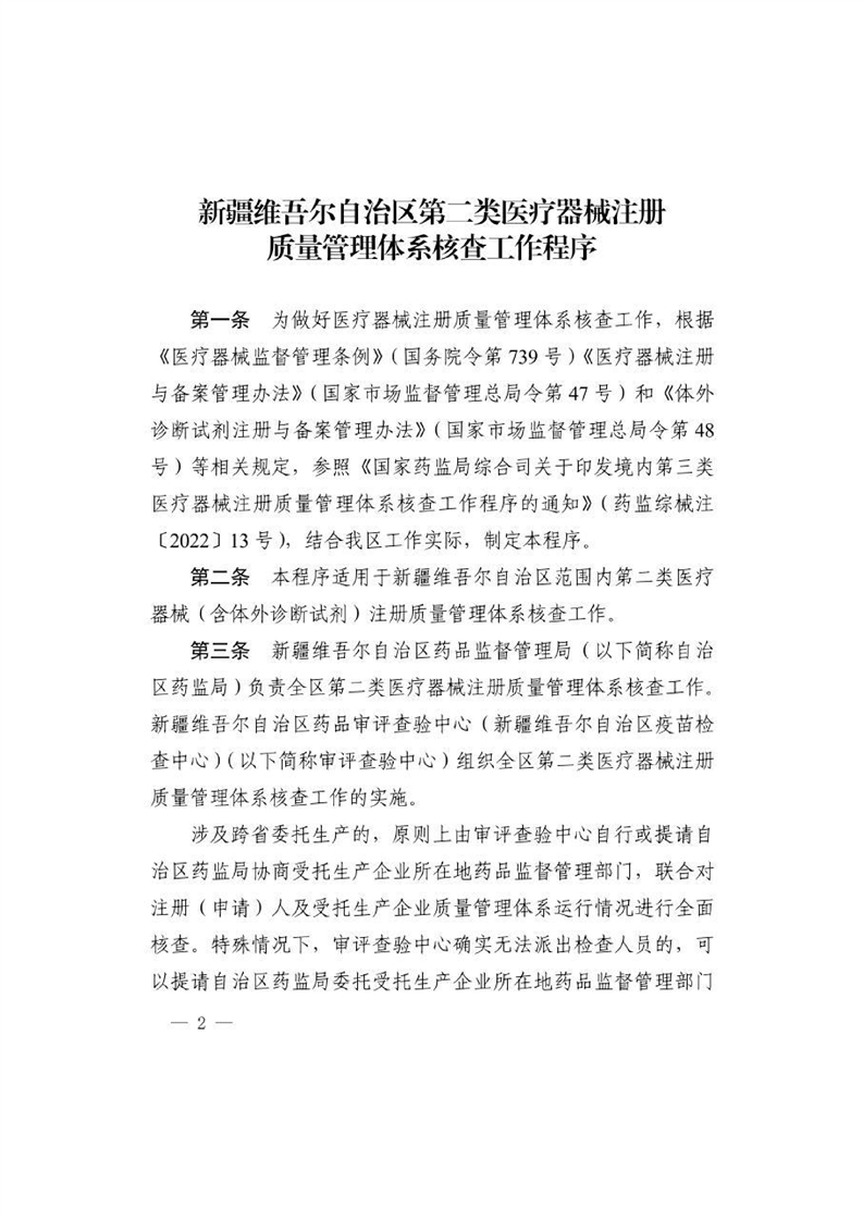 关于发布《新疆维吾尔自治区第二类医疗器械注册质量管理体系核查工作程序》的公告