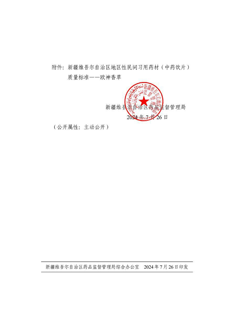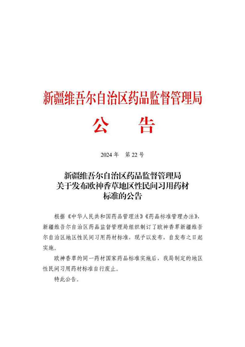 新疆维吾尔自治区药品监督管理局关于发布欧神香草地区性民间习用药材标准的公告