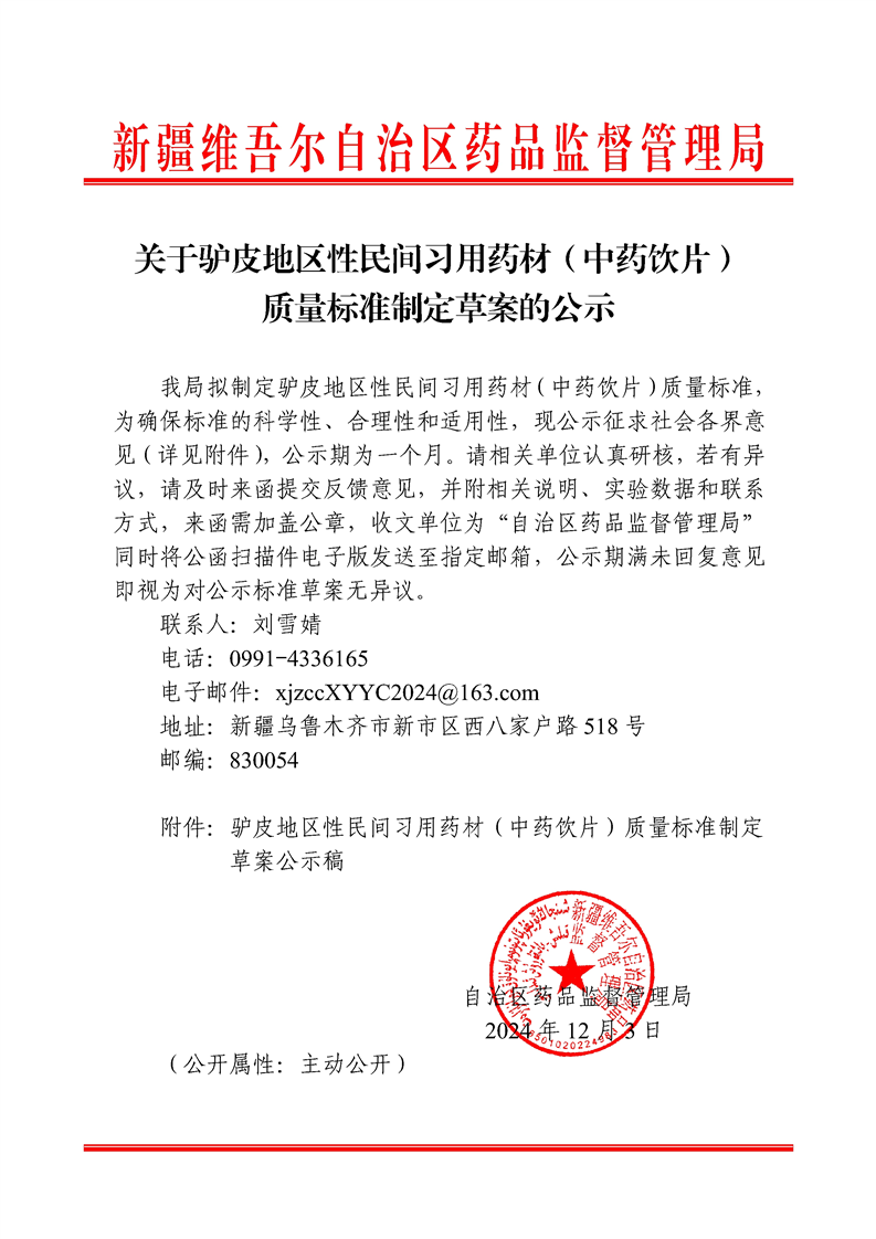 新疆维吾尔自治区药品监督管理局关于驴皮地区性民间习用药材(中药饮片)质量标准制定草案的公示