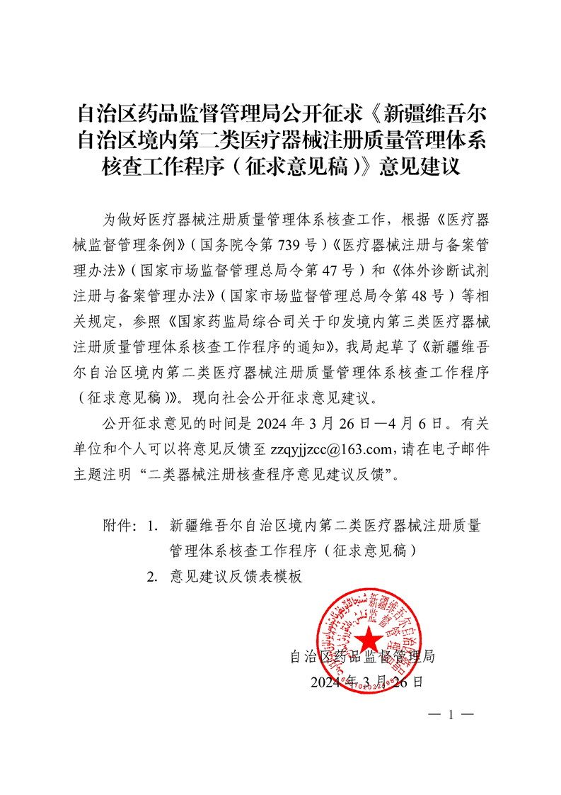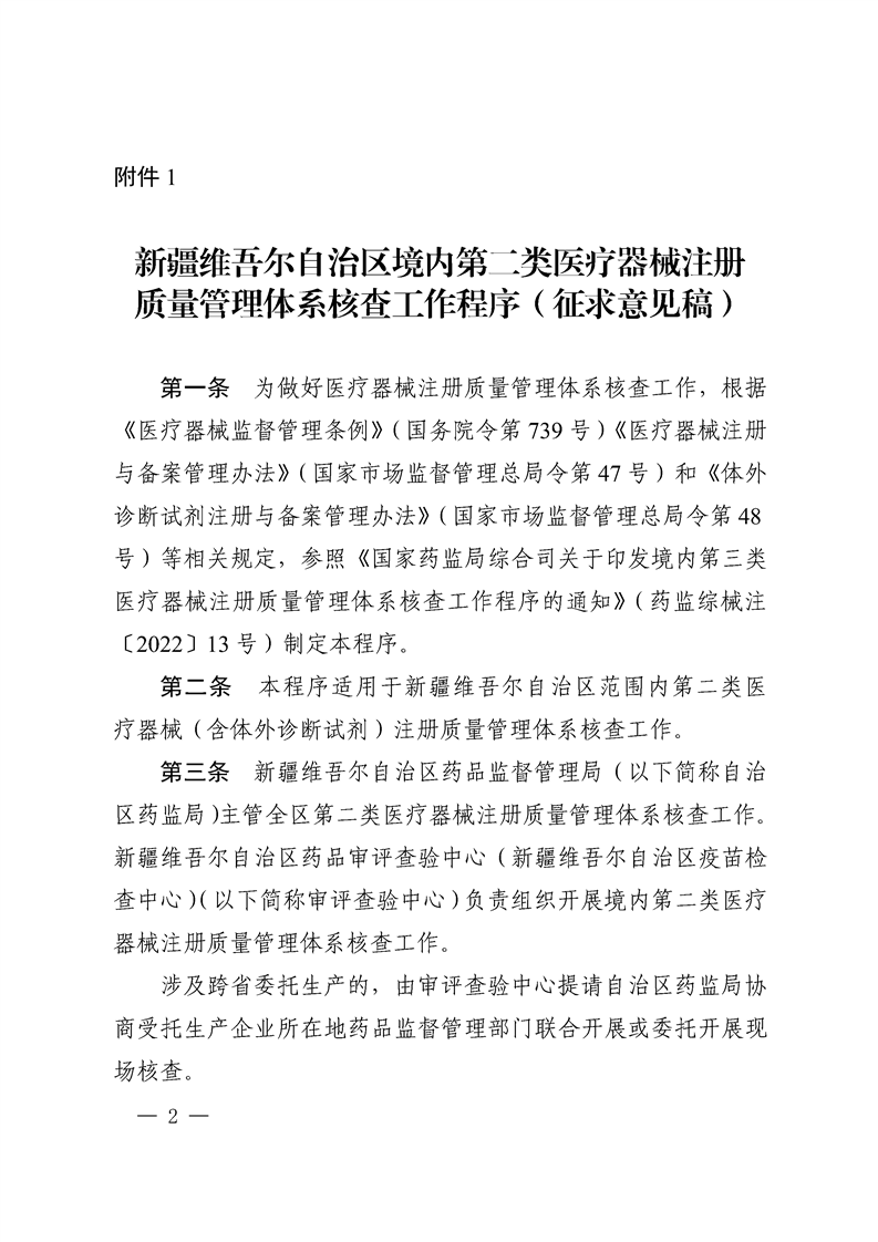 自治区药监局公开征求《新疆维吾尔自治区境内第二类医疗器械注册质量管理体系核查工作程序(征求意见稿)》意见建议的公告