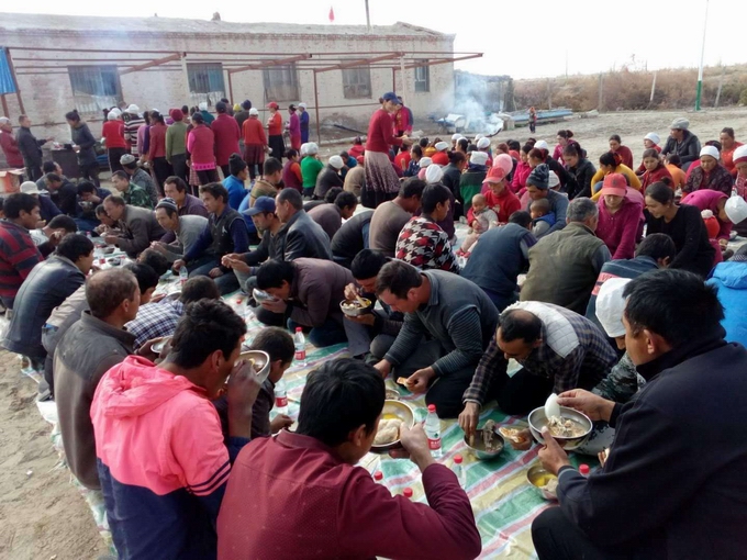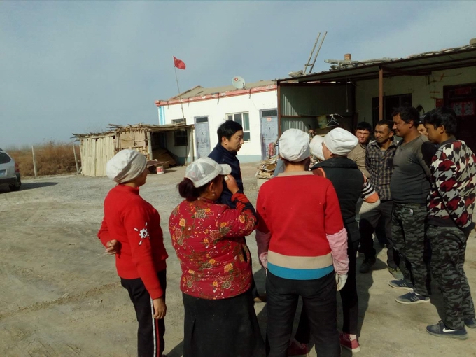 “心暖”——看望在阿克苏地区摘棉花的村民,把温暖带到棉田地头。11月9日,村第一书记、工作队队长马彦林、村支部书记艾科拜尔·马木提、工作队队员阿得江组成慰问组,前往阿瓦提县国营三场,看望160余名摘棉花的村民,了解他们的身体和工作情况。当村民们看到马书记一行时,都从田地里跑过来,围在他们身边,激动地握着手不愿松开,有的村民激动的流下眼泪。工作队购买了4只羊和400个馕,在村民的驻地支起4口大锅,160多名村民和慰问组一起席地而坐,吃了一顿热气腾腾的清炖羊肉。