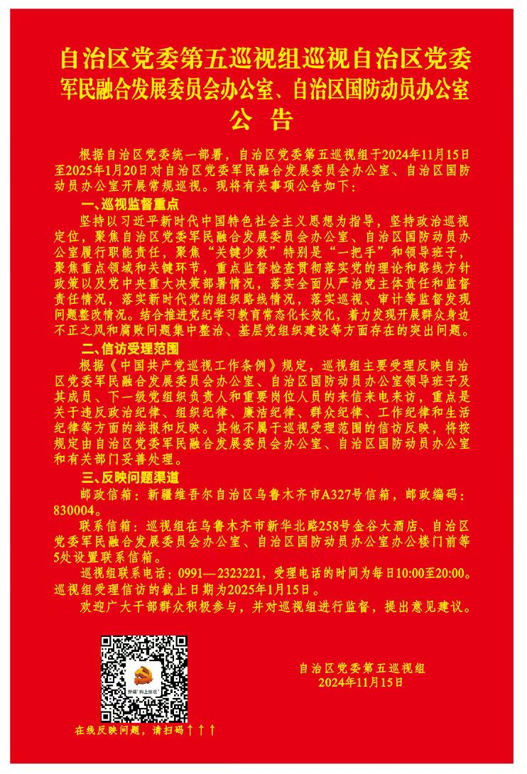 自治区党委第五巡视组巡视自治区党委军民融合发展委员会办公室、自治区国防动员办公室公告