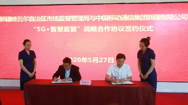 5月27日,自治区市场监管局与中国移动新疆分公司“5G 智慧监管”战略合作签约仪式在新疆移动大厦举行。活动中,新疆移动专家介绍 5G新基建规划、智慧监管能力建设情况及相关案例,并就市场监管的实际应用进行了现场演示。这标志着政企搭建长期合作平台,开启5G技术应用及合作的新时代。