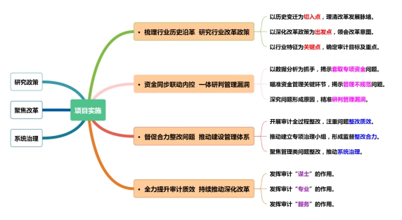 在该项目审计中,面对复杂情况、疑难问题,审计组还找到了解决问题的钥匙,这把钥匙就是研究型审计。主审朱瑞说:“是研究型审计让我们懂得了如何思考问题,因为研究,我们创建了四阶段工作法,第一阶段:梳理行业历史沿革,研究行业改革政策;第二阶段:资金同步联动内控,一体研判管理漏洞;第三阶段:督促合力整改问题,推动建设管理体系;第四阶段:全力提升审计质效,持续推动深化改革。通过四阶段工作法,我们体会到了什么是研究型审计,也体会到了如何处理监督与服务的关系,可谓是受益良多。”