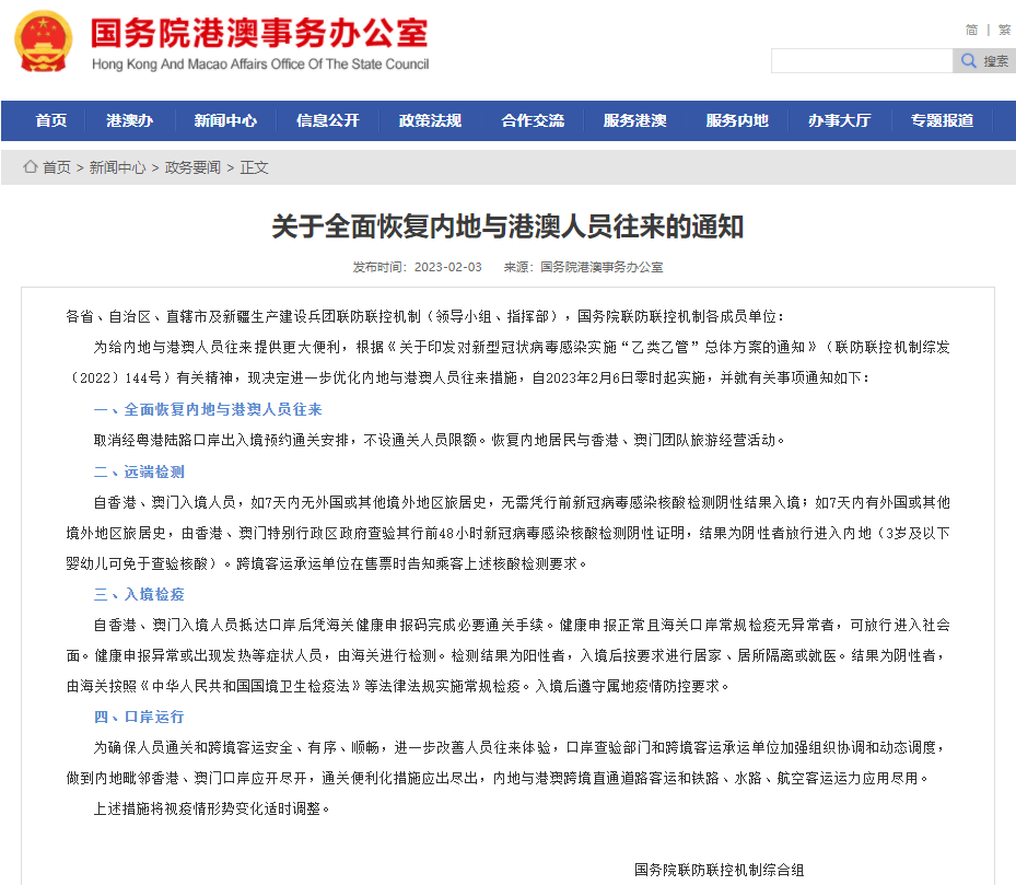 为给内地与港澳人员往来提供更大便利,根据《关于印发对新型冠状病毒感染实施“乙类乙管”总体方案的通知》(联防联控机制综发〔2022〕144号)有关精神,现决定进一步优化内地与港澳人员往来措施,自2023年2月6日零时起实施,并就有关事项通知如下:
