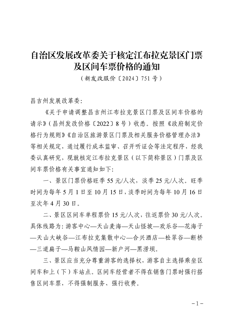 自治区发展改革委关于核定江布拉克景区门票及区间车票价格的通知 (新发改服价〔2024〕751号)